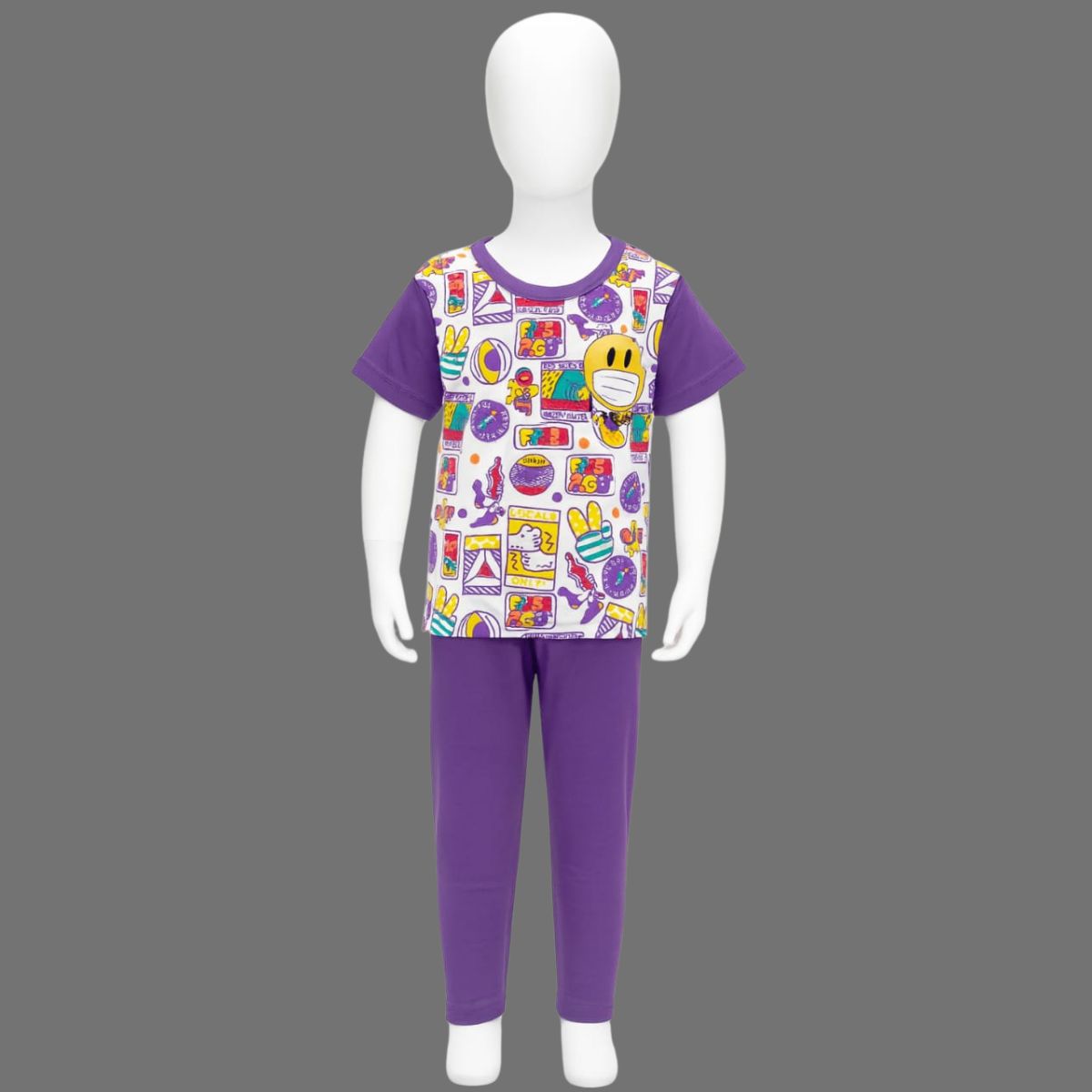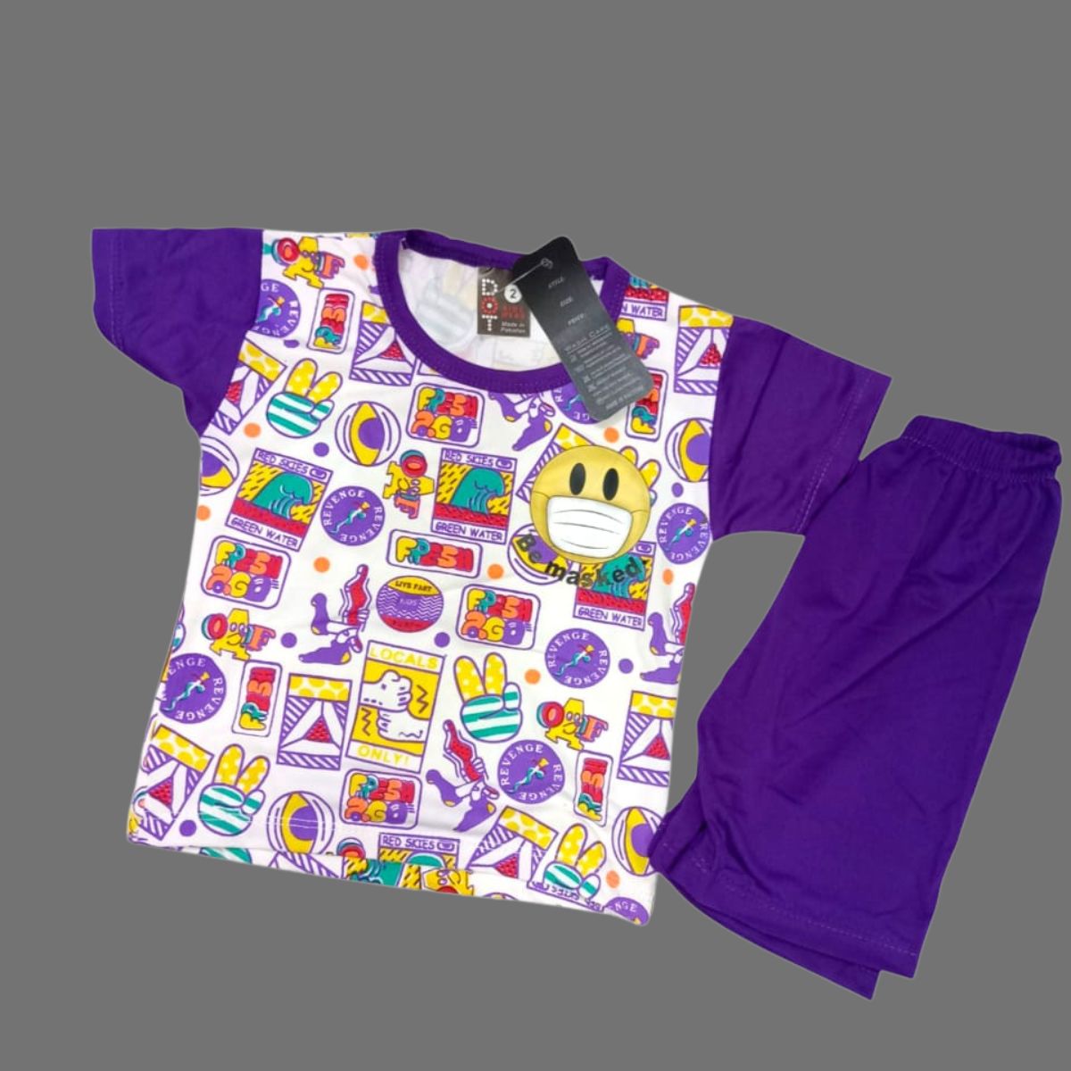 Fun and colorful kids’ summer outfit featuring a cartoon-printed T-shirt with matching shorts. Soft, breathable, and perfect for daily wear. Available in Purple & Red colors.