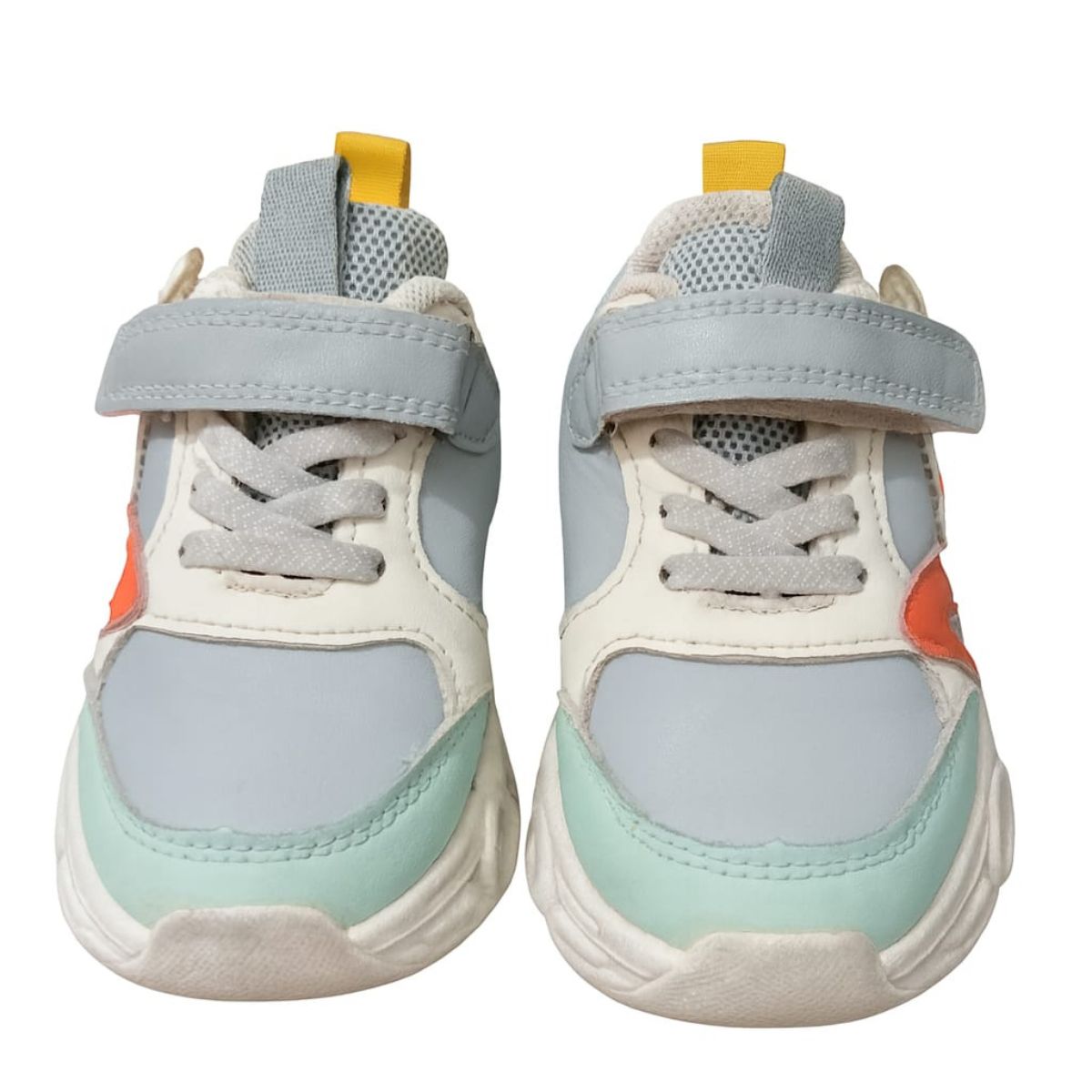 These stylish kids’ sneakers are designed for everyday comfort and playful fashion. Made with a combination of soft mesh and premium synthetic leather, they provide excellent breathability and durability. The pastel color combination of light blue, mint green, and white with a touch of orange adds a fun and trendy look your child will love.